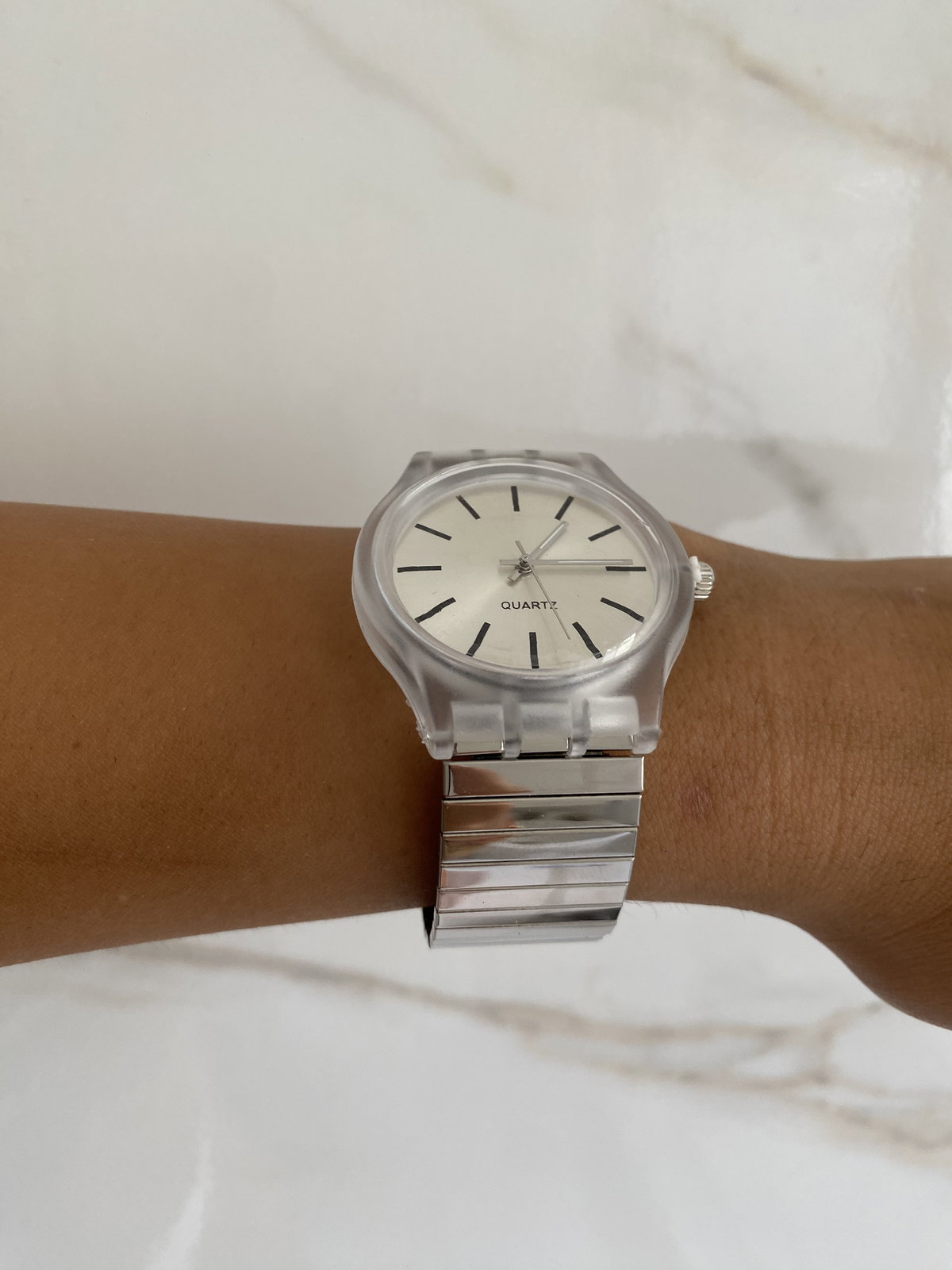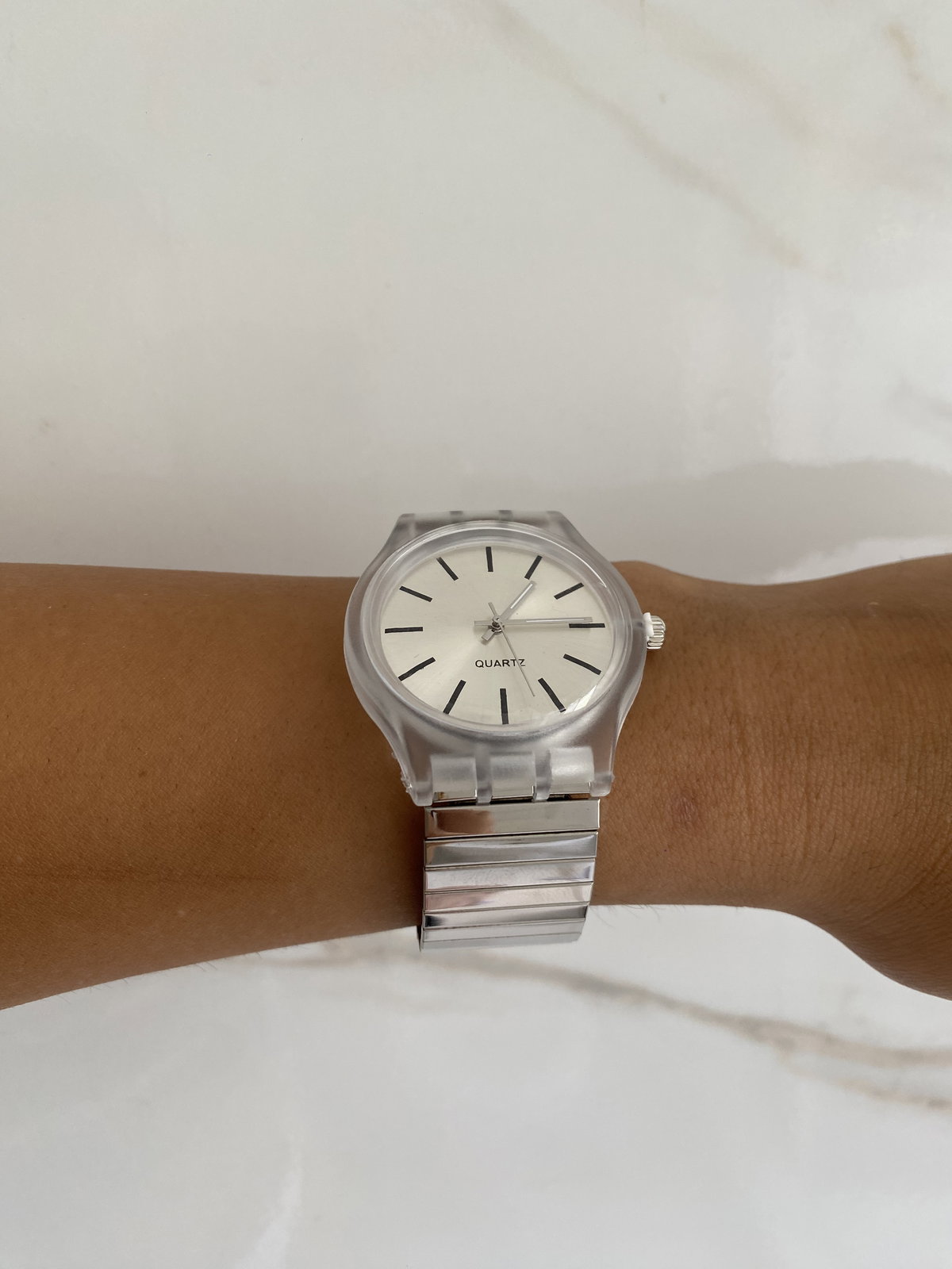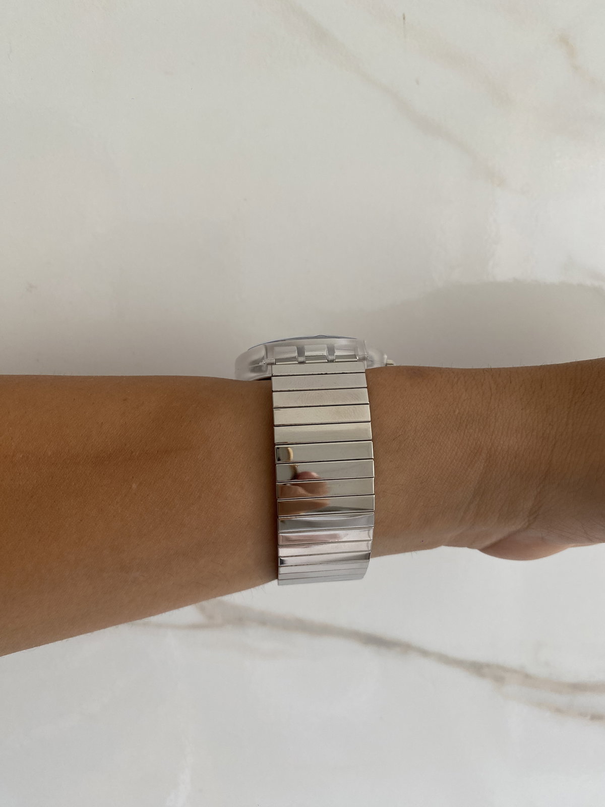 Reloj analógico con malla de acero elastizada en color plata
