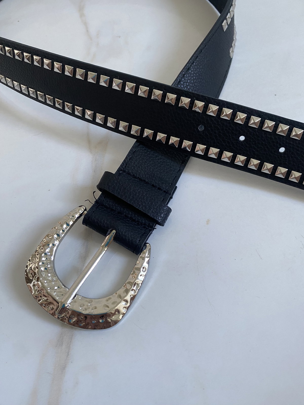 CINTURON DE CUERO, con hebilla metalizada, tachas en todo el largo del cinto.