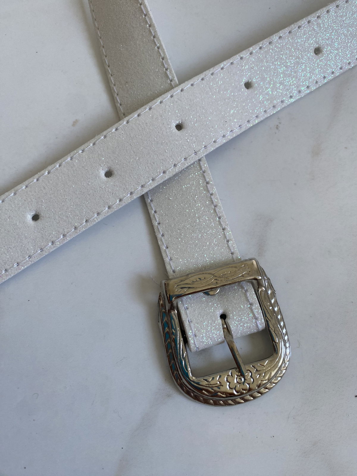 CINTURON DE ClUERINA BLANCA, , con hebilla metalizada. Brillos en todo el cinto