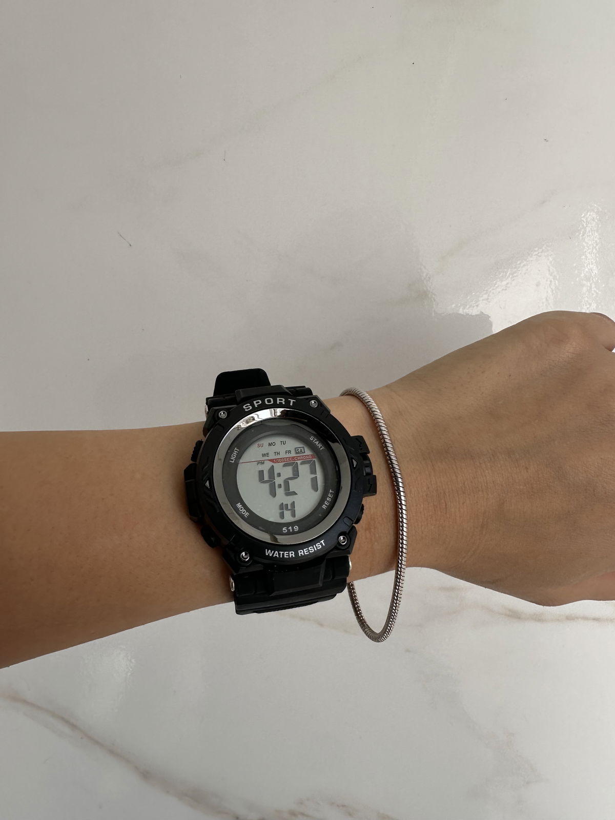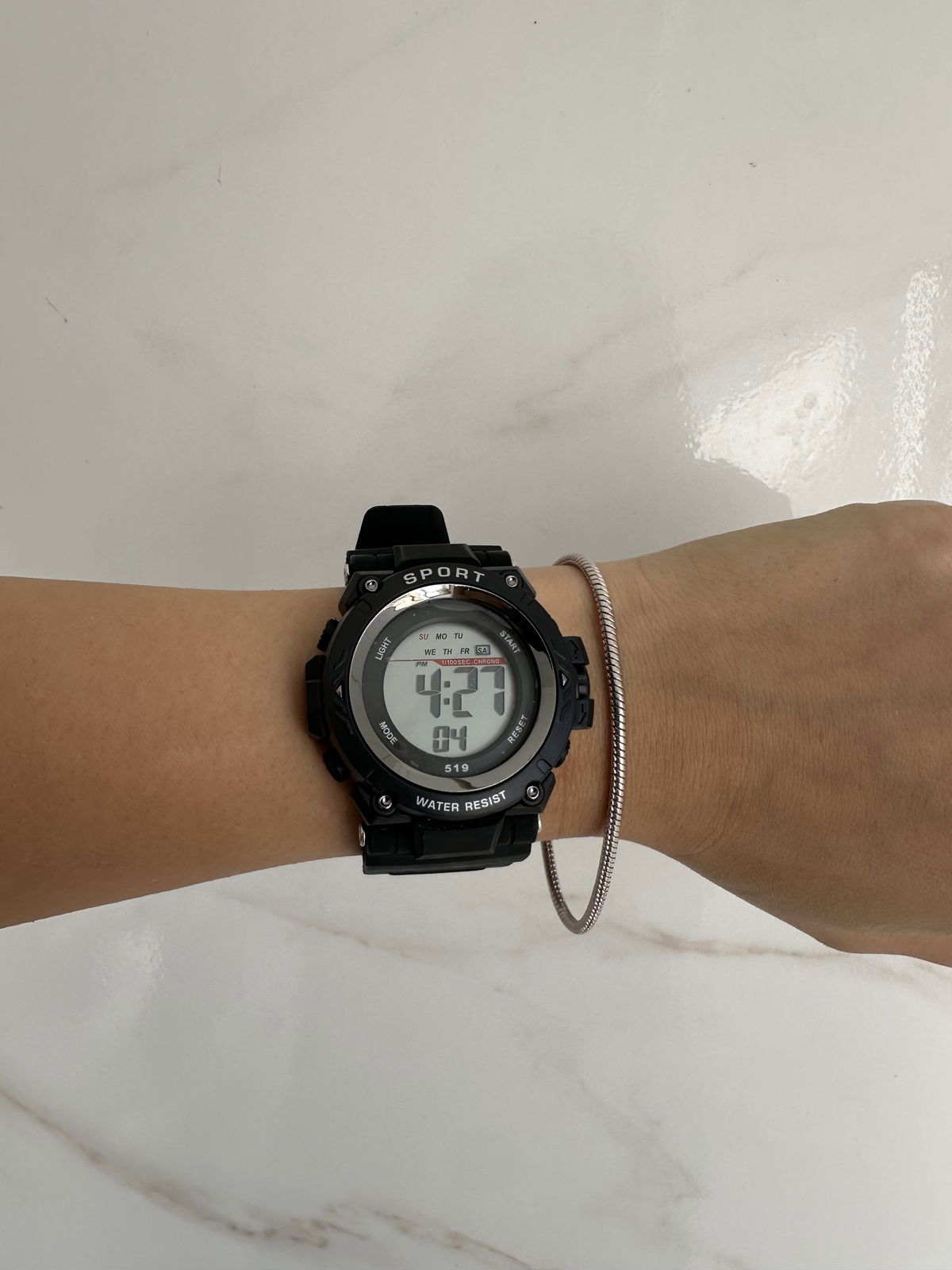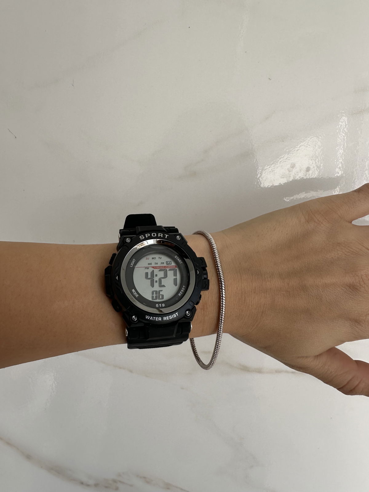 marca fecha hora, alarma y cronómetro.
