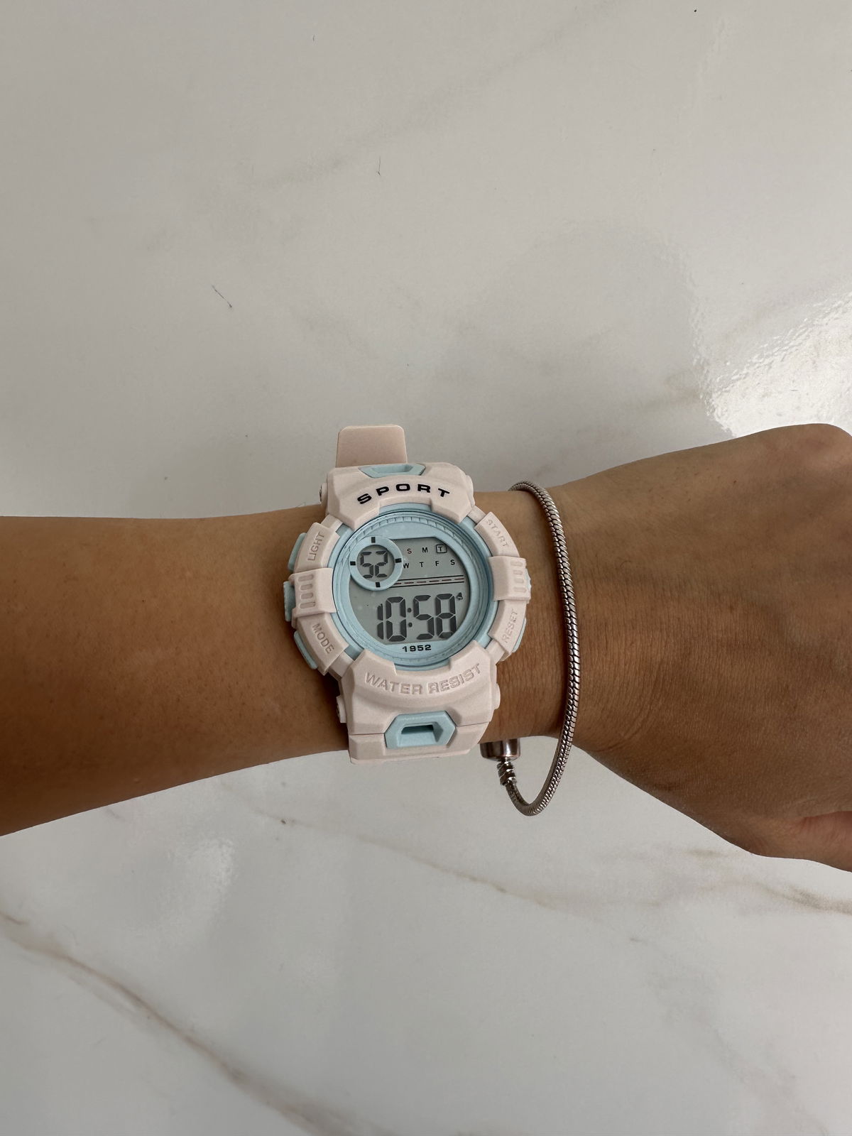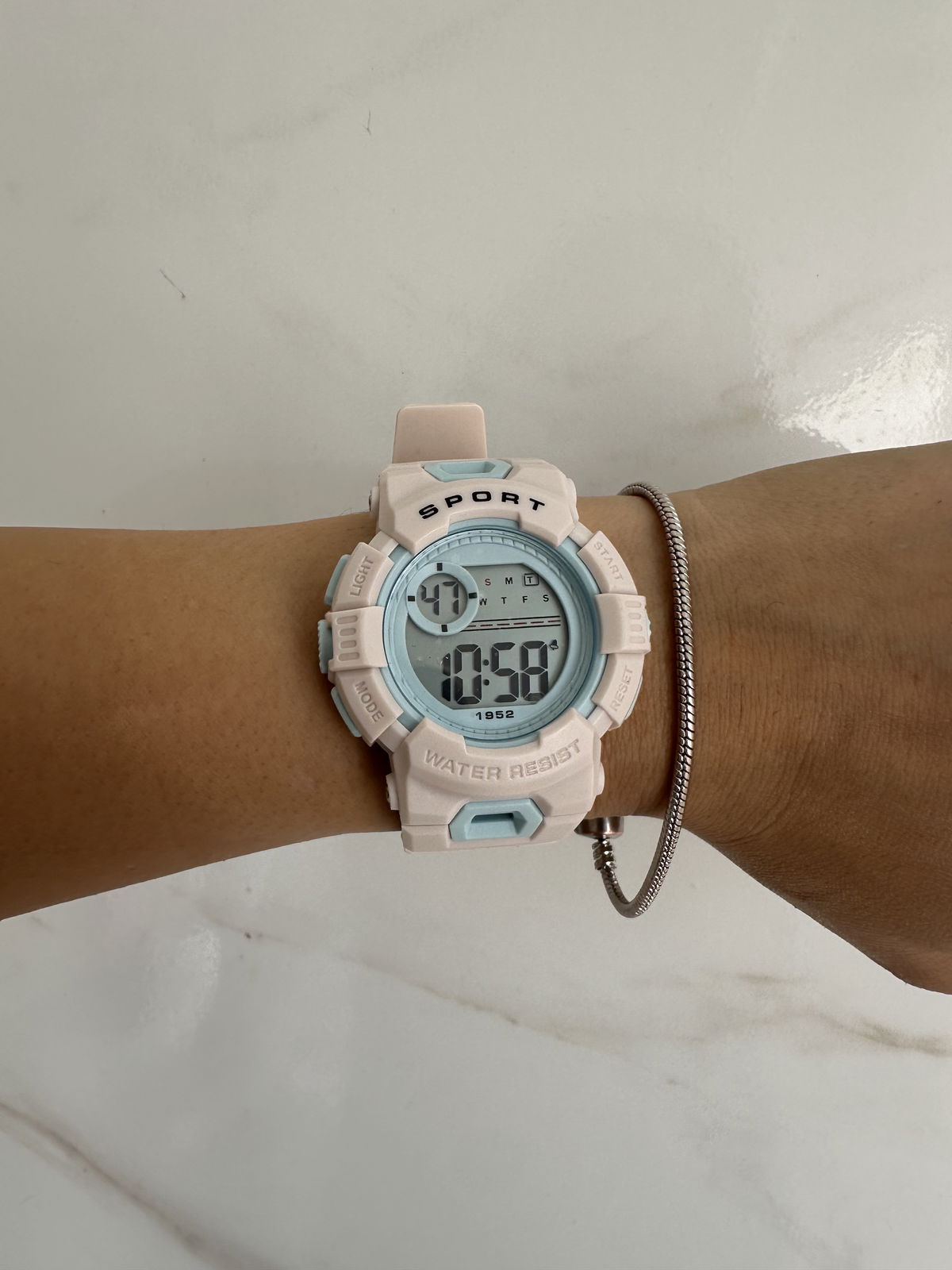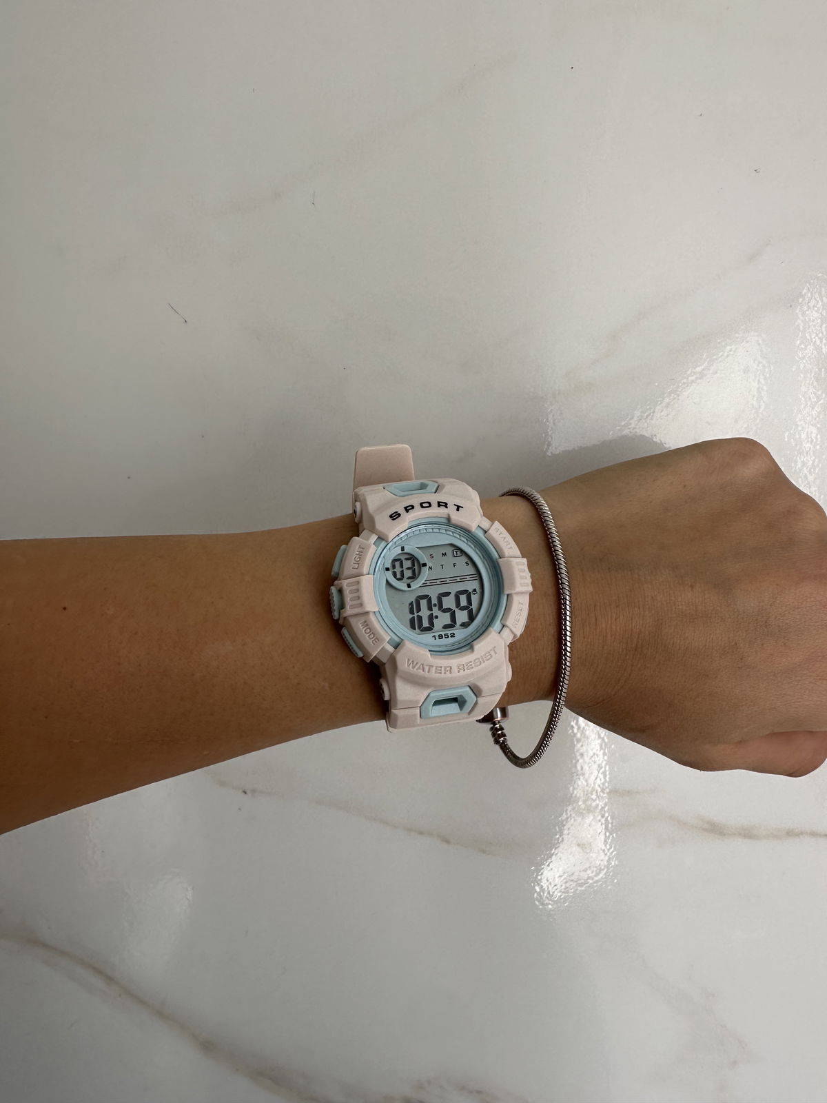 marca fecha hora, alarma y cronómetro.