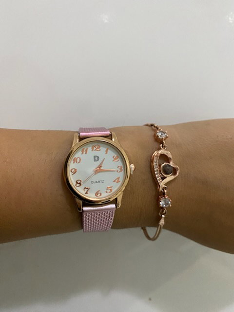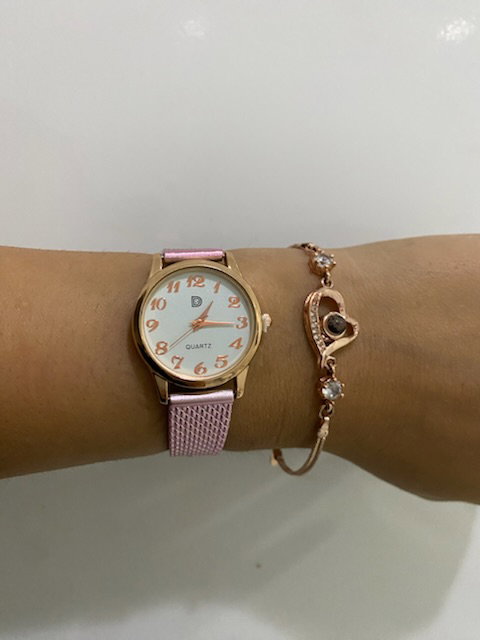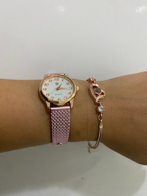 reloj analógico, malla de silicona maleable pintada en rosa metalizado
