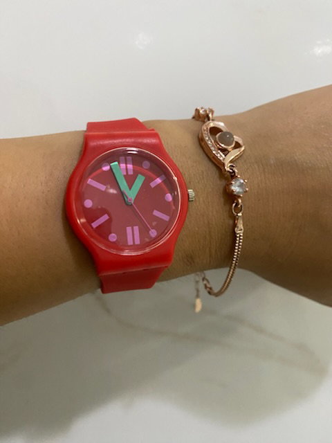 reloj analógico, malla de silicona maleable con cuadrante de plástico en rojo