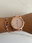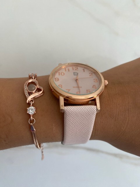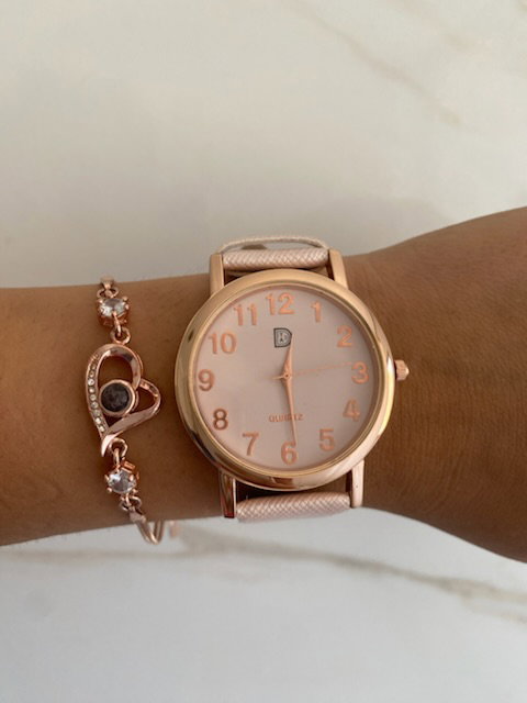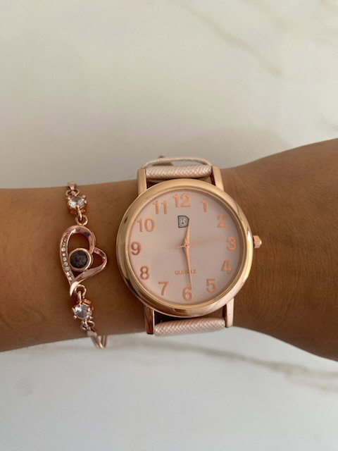 reloj analógico, malla de ecocuero texturizado color rosa bebé, cuadrante metálico en color dorado.