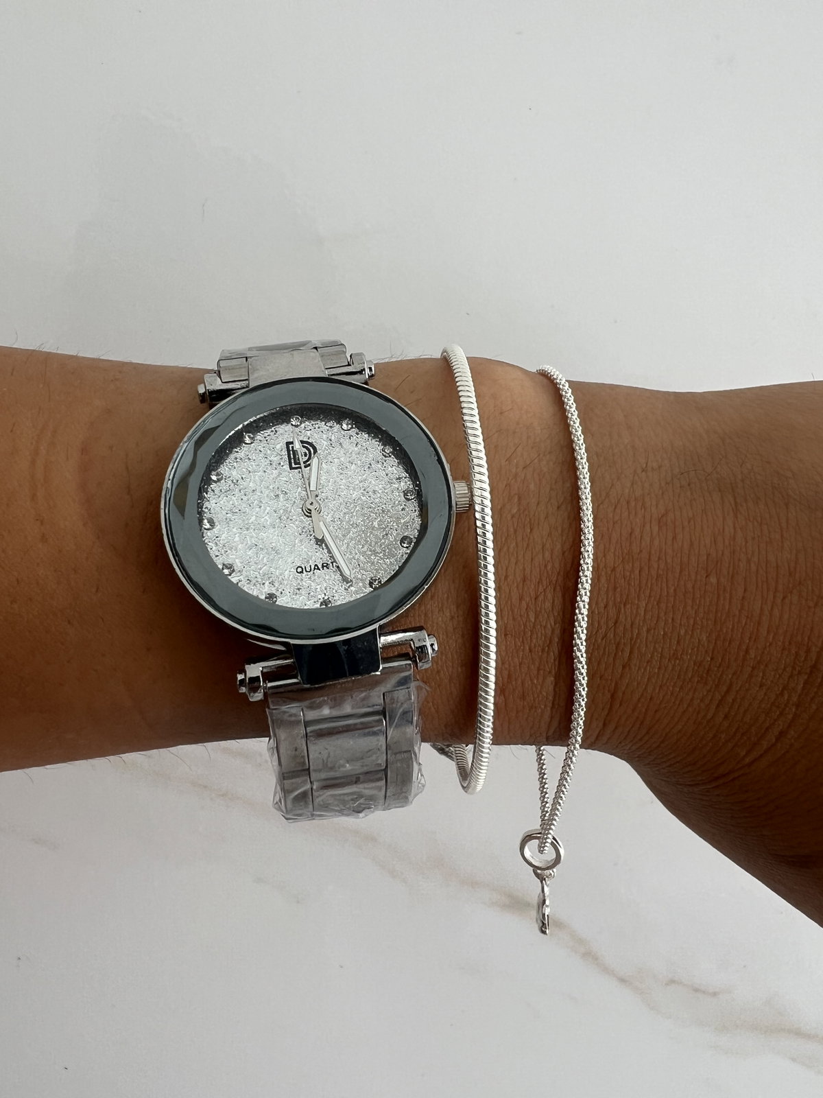 Reloj analógico metalizado con malla de eslabones.