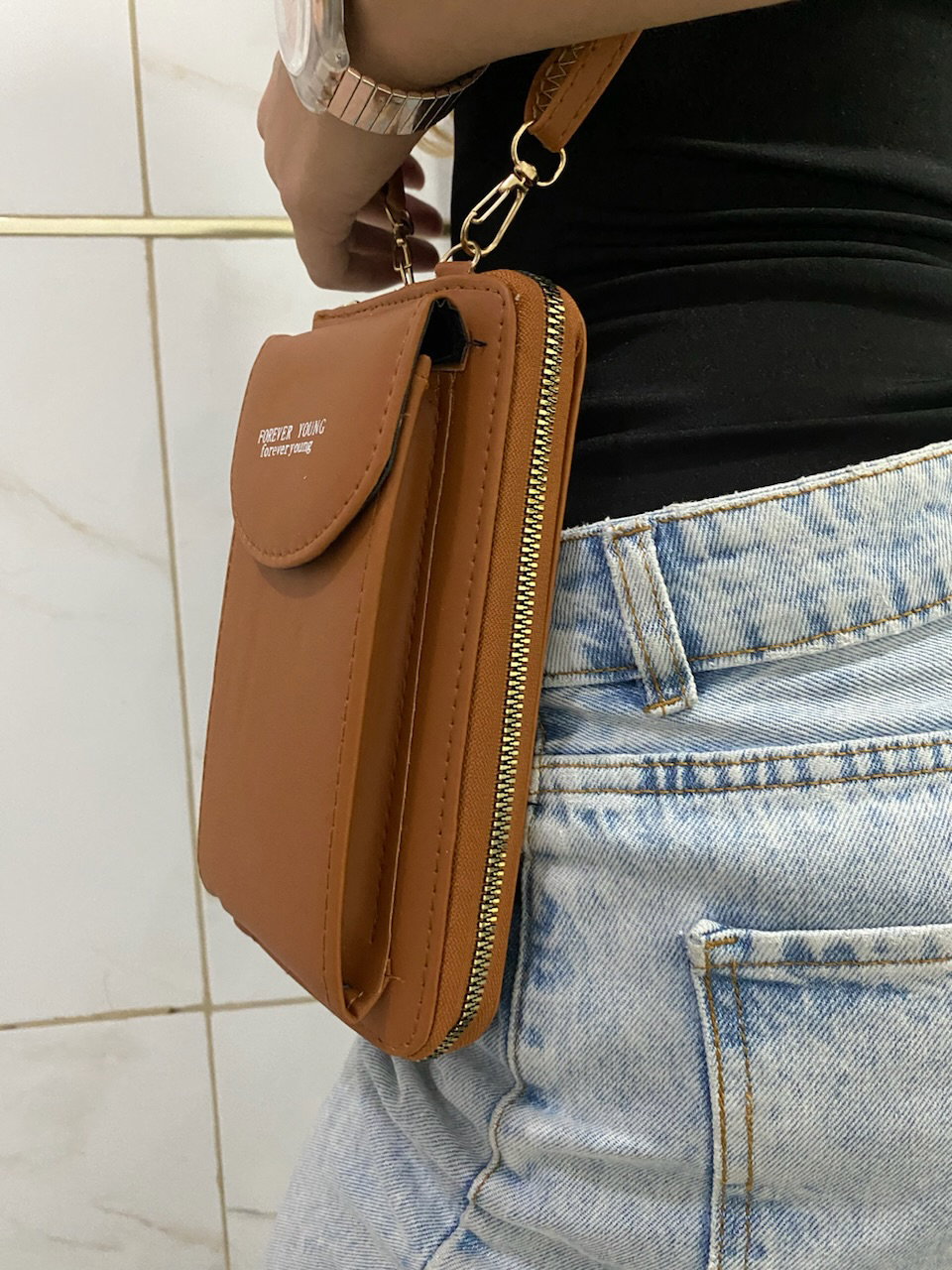 trae correa intercambiable para hacer bandolera o billetera.