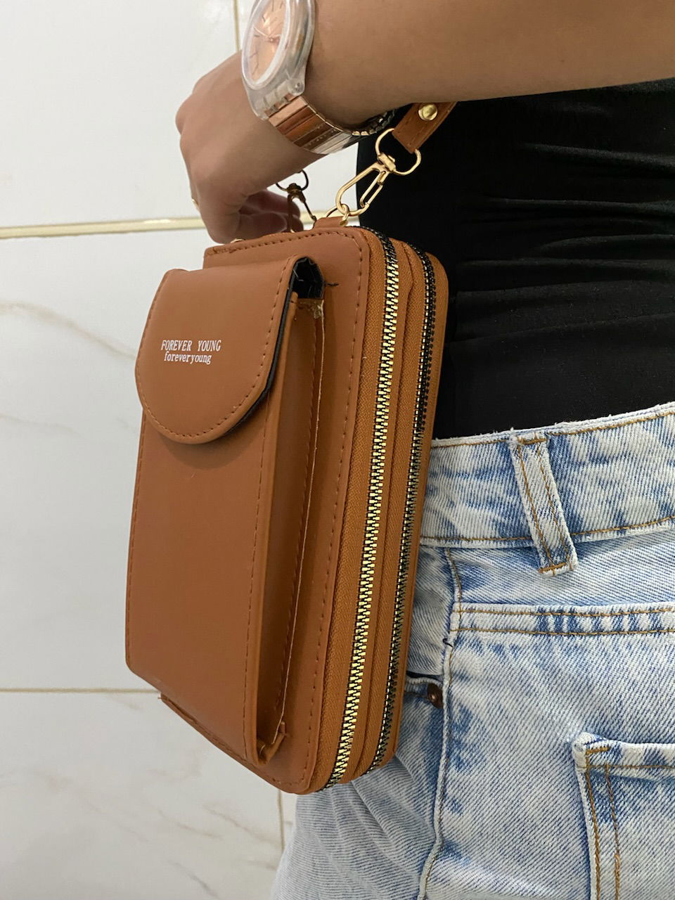 trae correa intercambiable para hacer bandolera o billetera.